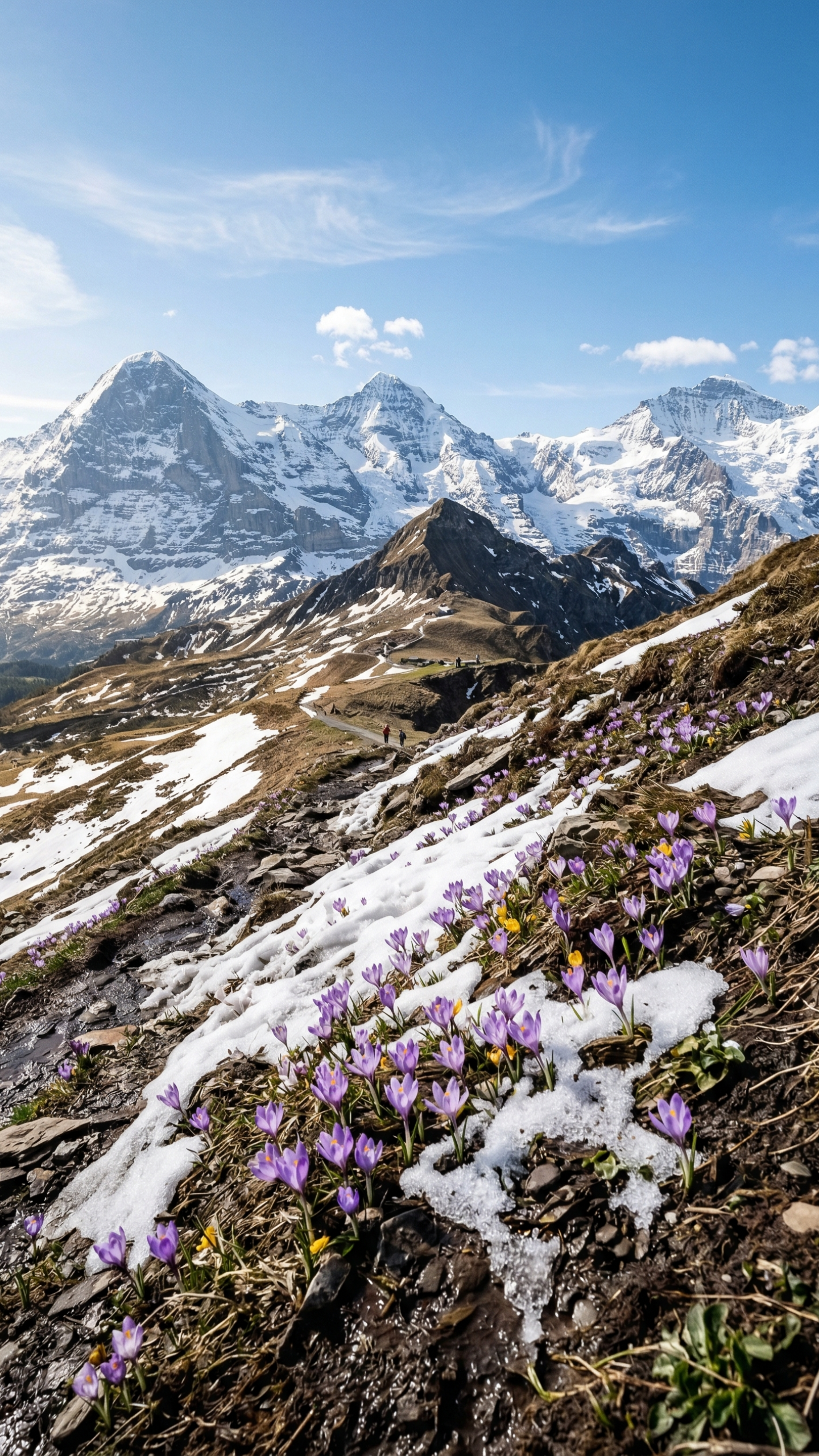 A stunning depiction of seasons in conflict, where hardy purple wildflowers defy the lingering winter snow beneath towering peaks.
